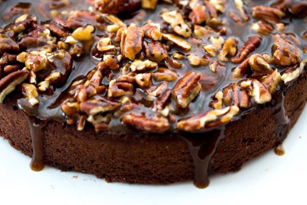 Frönsk súkkulaðikaka með pekanhnetukurli og heitri karmellusósu